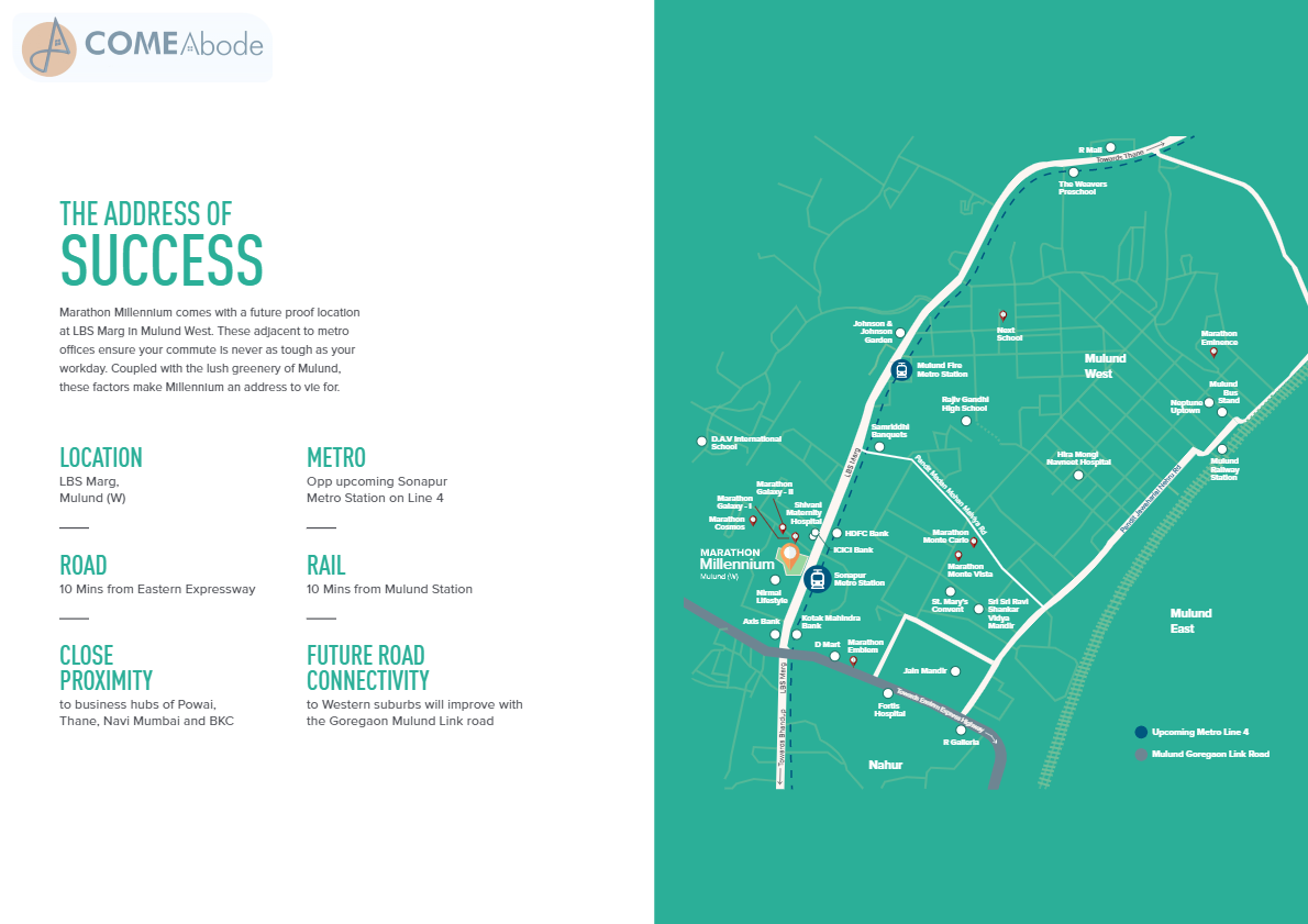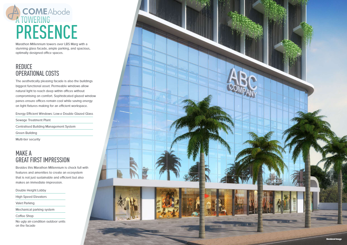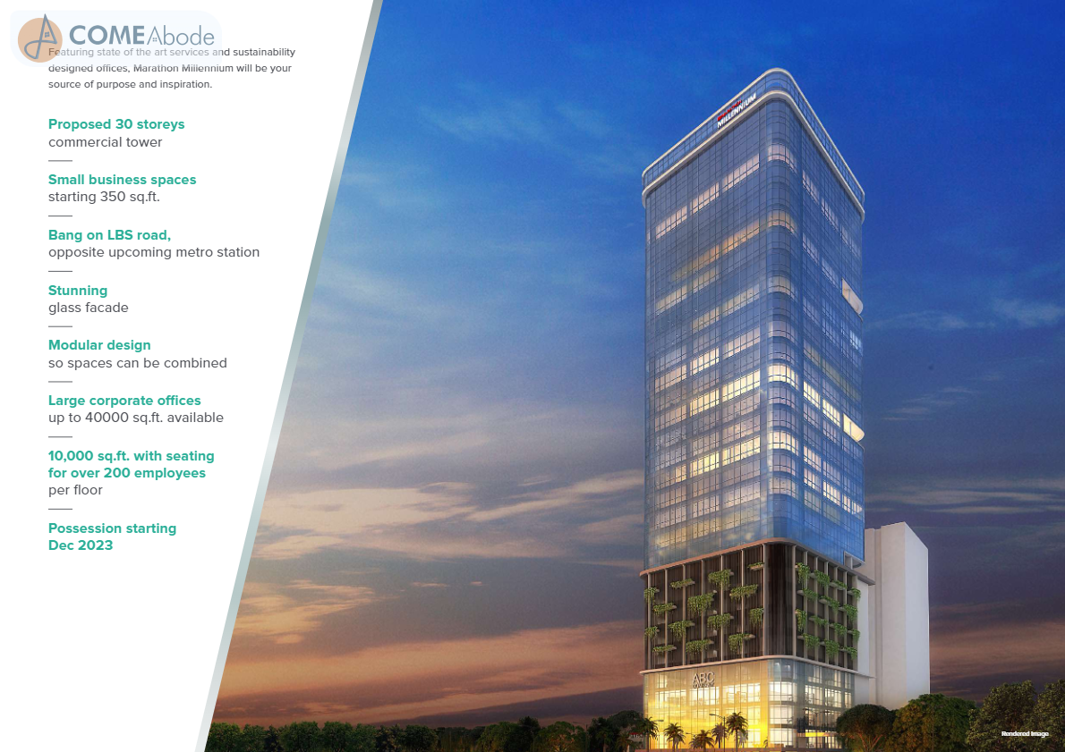 Marathon Millennium is to build a workplace that is designed for success. An amalgamation of the ideal location, the perfect floor plans and flawless execution, this commercial tower is the place to be for your business to flourish. Marathon Millennium comes with a future proof location at LBS Marg in Mulund West. The Commercial complex is equipped with top-of-the-line amenities that are ideal for people of all ages.The commencement certificate of Marathon Millennium has been granted.